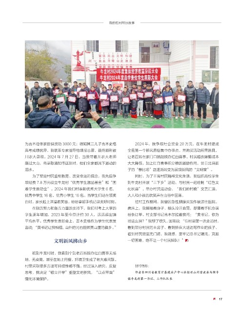 难学生救助金”。2024 年我们村表彰优秀大学生 6 名, 化长廊”,举办村民运动会、“我们的村晚”文艺汇演,