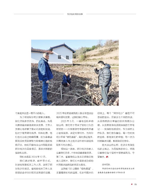 但对于能否简化程序、特殊处理,他 示省残联后,决定特事特办,为阿尔 作队员,我们身负重任,每一位村民